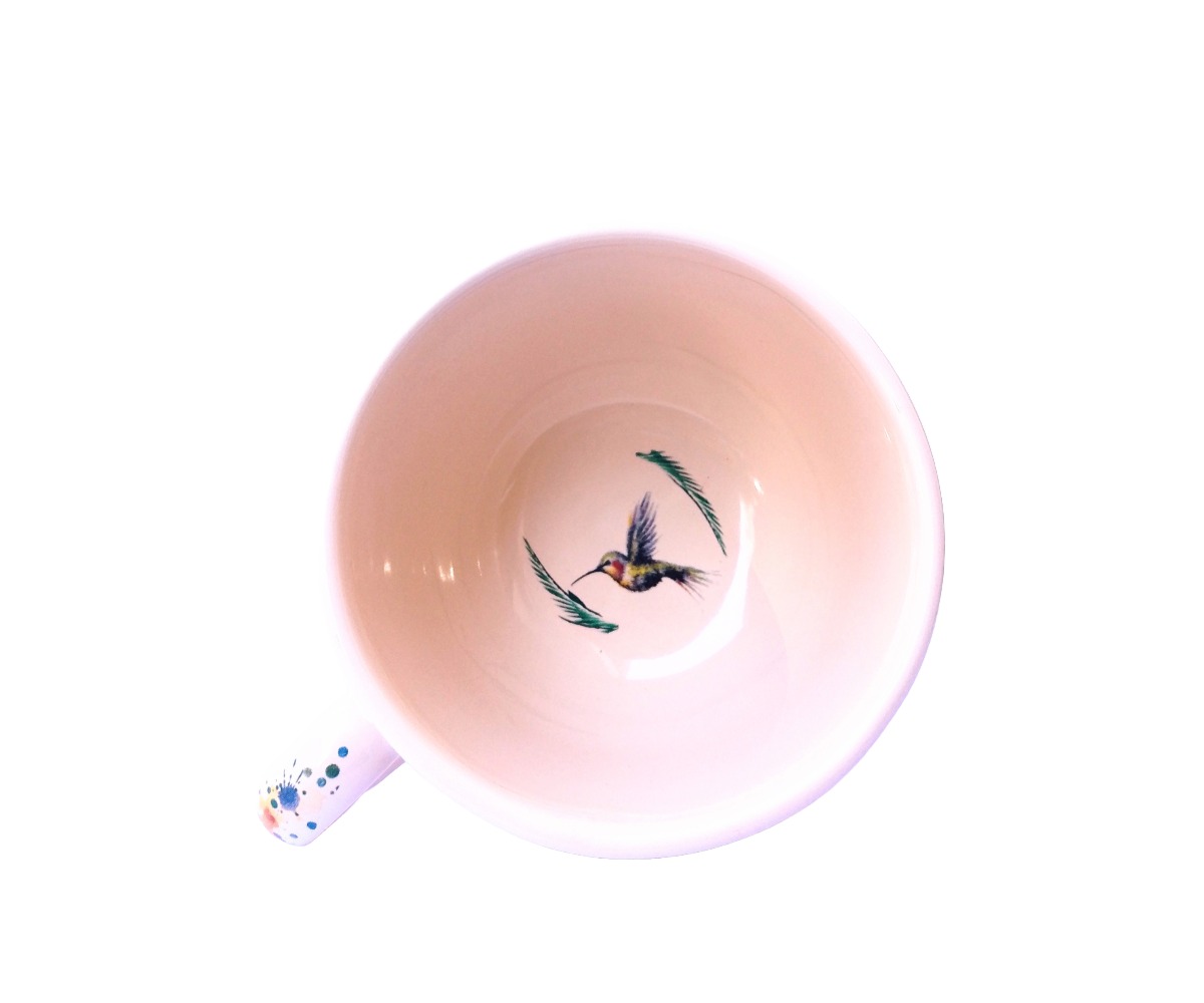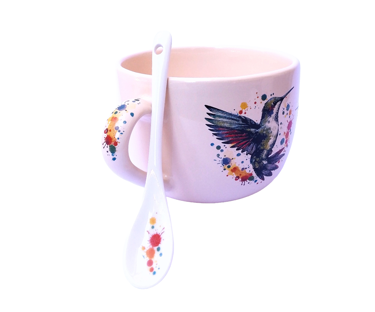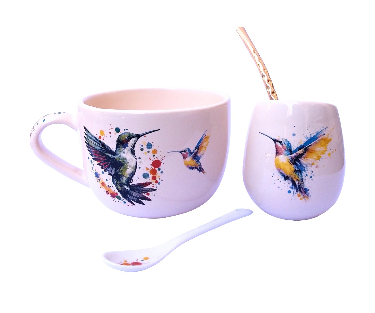 Tazón de cerámica modelo MIDI 600 CC – Diseño Colibrí. (Incluye cuchara a tono) + Mate de cerámica diseño colibrí (incluye bombilla).
